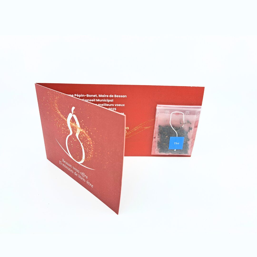 Vous cherchiez une façon originale de souhaiter les voeux et la nouvelle année ? Découvrez la carte de voeux thé ! Il s’agit à première vue d’une carte de voeux classique, au vu de son aspect et de son format. Mais en fait, cette carte présente un sachet de thé. Le format 20 x 10 cm est un format classique d’envoi postal. Le format de la carte ouvert est de 35 x 10 cm. La carte n’est pas totalement refermée. En effet, elle laisse apparaitre le sachet de thé. La carte peut également se décliner en carte d’invitation, de remerciement, ou encore de correspondance, selon l’événement que vous souhaitez mettre en valeur. Le gabarit de personnalisation pour la préparation de votre fichier est disponible dans l’onglet « téléchargement »
